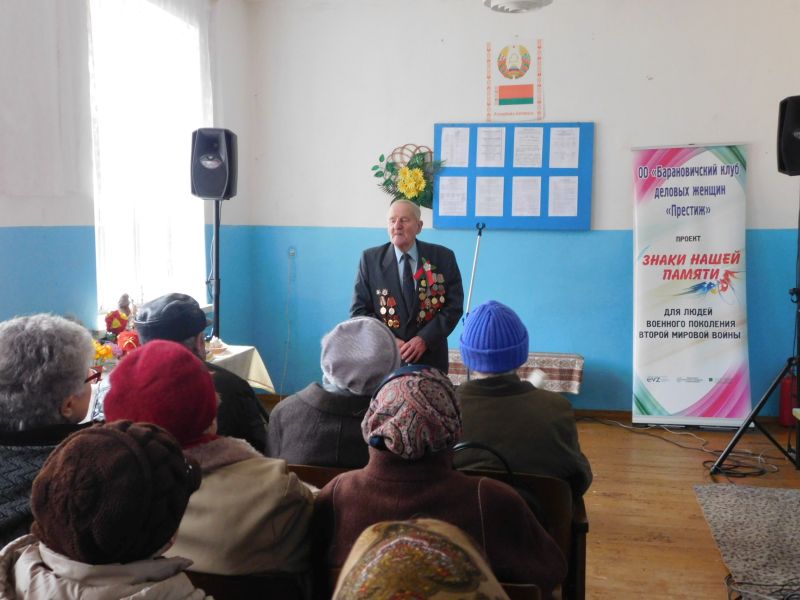 Представитель Общественной организации «Барановичский клуб деловых женщин «Престиж» Наталья Биттнер ознакомила присутствующих о ходе реализации проекта «Знаки нашей памяти», его целях и задачах, направленных на улучшение качества жизни граждан, пострадавших от нацистских преследований в период Второй мировой войны, привлечения внимания молодежи к роли пожилых людей в обществе, их потребностям и интересам. Узникам, проживающим на территории Городищенского сельского совета (Филончик Я.А., Решотка О.Н., Кривулько Р.П., Вайтушко Л.Г., Позняк Е.Н.) были вручены цветы.